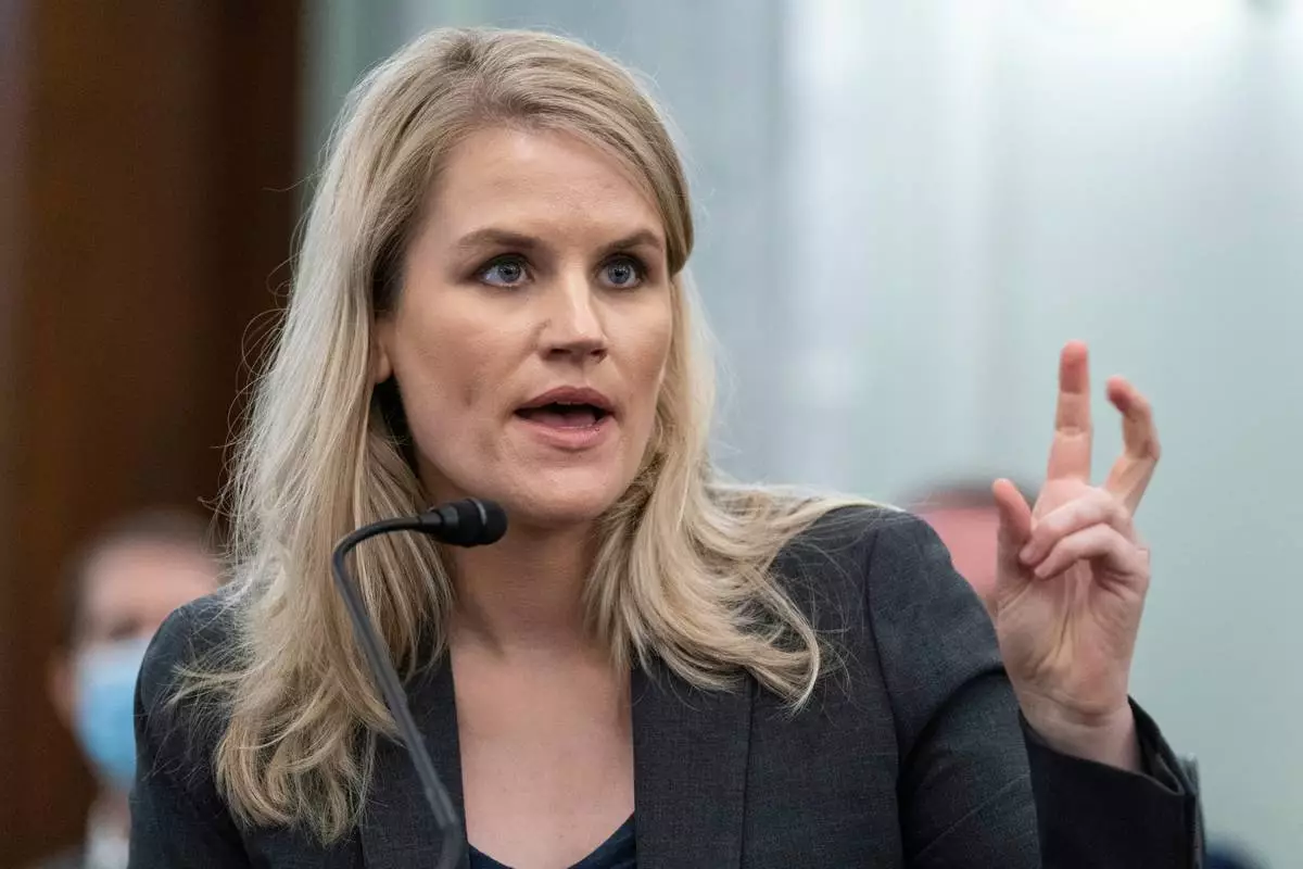 FILE - Former Facebook data scientist Frances Haugen speaks during a hearing of the Senate Commerce, Science, and Transportation Subcommittee on Consumer Protection, Product Safety, and Data Security, on Capitol Hill, Tuesday, Oct. 5, 2021, in Washington. (AP Photo/Alex Brandon, File)