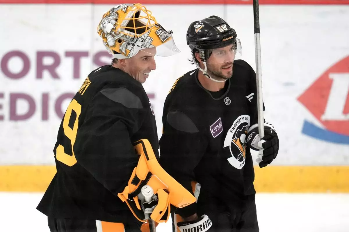 Pittsburgh Penguins goalie Marc-Andre Fleury, left, and Kris Letting take a break during the NHL hockey team's pre-game skate in Cranberry Township, Pa., Friday, Sept. 26, 2025. (AP Photo/Gene J. Puskar)