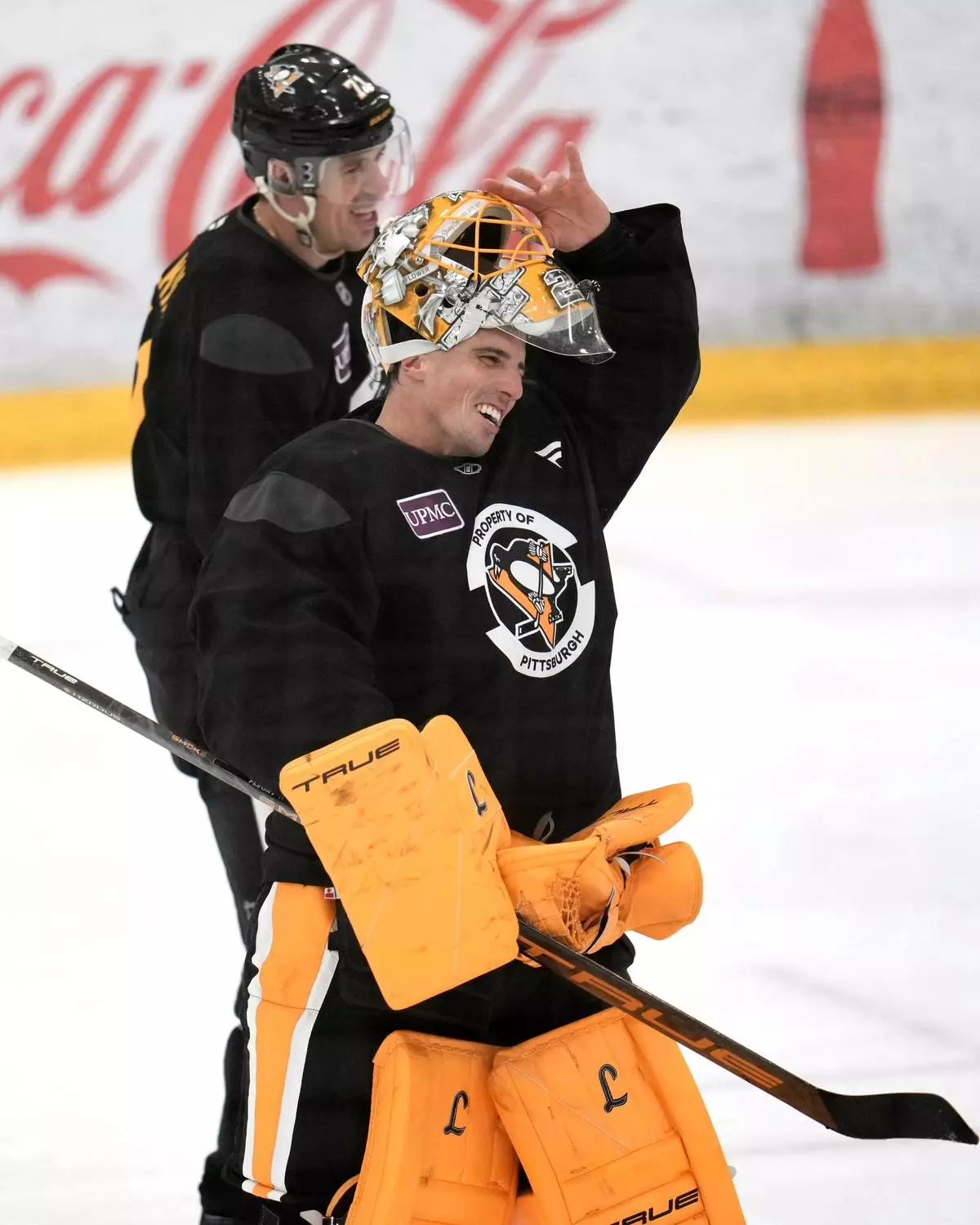 Pittsburgh Penguins goalie Marc-Andre Fleury, rear, has a laugh with Sidney Crosby during a break in the NHL hockey team's pre-game skate in Cranberry Township, Pa., Friday, Sept. 26, 2025. (AP Photo/Gene J. Puskar)