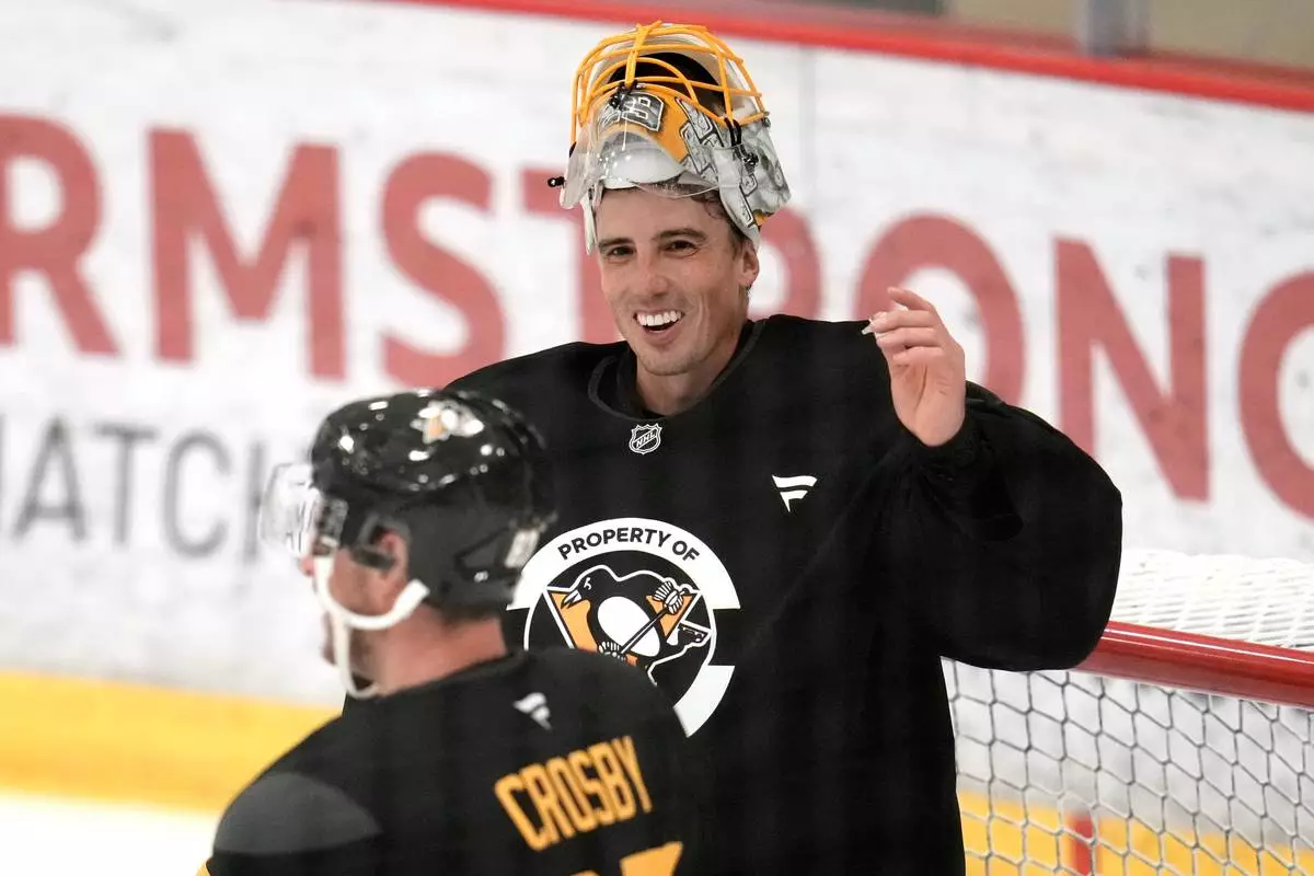 Pittsburgh Penguins goalie Marc-Andre Fleury waits his turn in net during the NHL hockey team's pre-game skate in Cranberry Township, Pa., Friday, Sept. 26, 2025. (AP Photo/Gene J. Puskar)