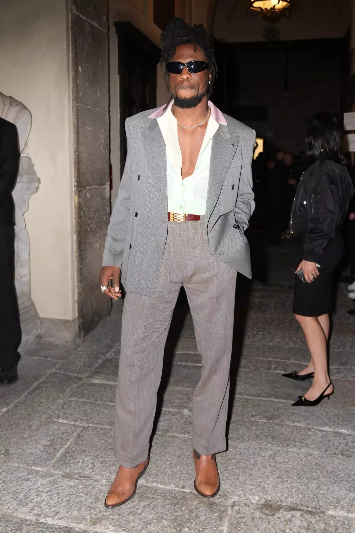 Singer Ob Obongjayar arrives for the Versace Intimate fashion event, in Milan, Friday, Sept. 26, 2025. (AP Photo/Antonio Calanni)
