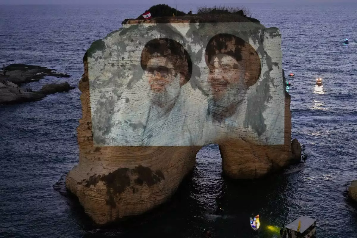 Portraits of former Hezbollah leaders Sayyed Hassan Nasrallah, right, and Hashem Safieddine, are projected onto the landmark Raouche sea rock during an event commemorating the anniversary of their assassination, in Beirut, Lebanon, Thursday, Sept. 25, 2025. (AP Photo/Hussein Malla)