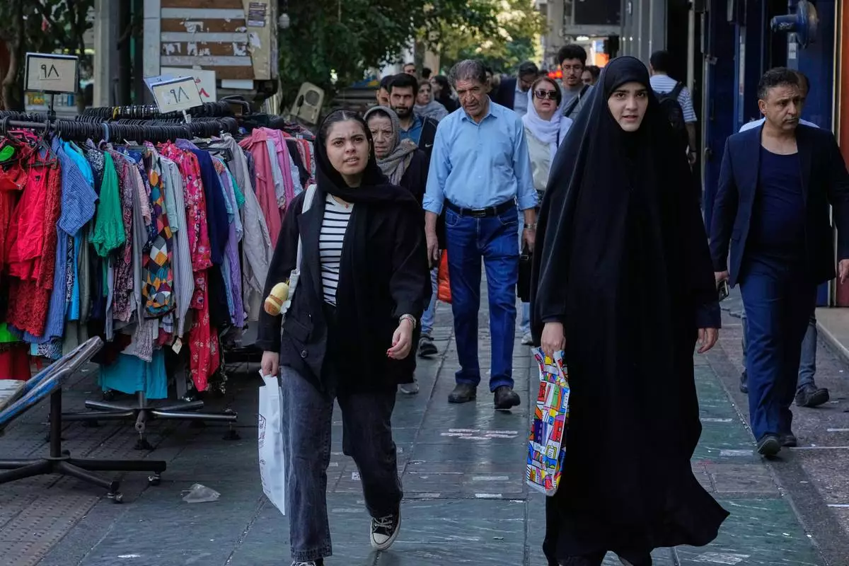 People walk on a sidewalk at the Enqelab-e-Eslami (Islamic Revolution) street, in Tehran, Iran, Saturday, Sept. 27, 2025. (AP Photo/Vahid Salemi)