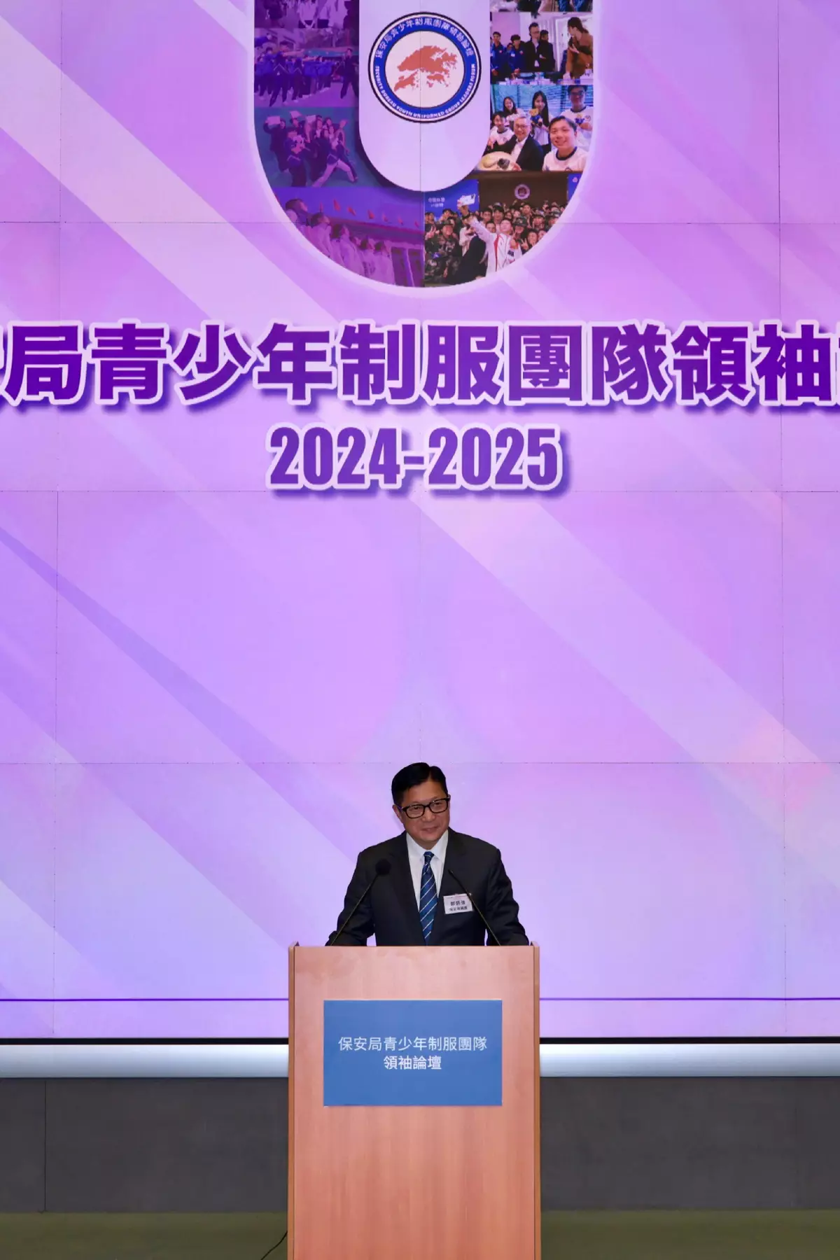 Concluding the event, the Secretary for Security, Mr Tang Ping-keung, highlighted the significant achievements of the members of the Leaders Forum last year. These included four members representing Hong Kong youth to attend the military parade in commemoration of the 80th Anniversary of Victory in the Chinese People's War of Resistance Against Japanese Aggression and the World Anti-Fascist War in Beijing; a member, as the youth representative of Hong Kong, China, taking part in the Voices of the Future programme organised by the Asia-Pacific Economic Cooperation in Peru in 2024; and seven members being awarded the stars of self-improvement of Chinese college students, an award presented to only 20 students in Hong Kong. Mr Tang added that 42 members did summer internships in renowned enterprises or organisations in cities such as Beijing, Shanghai, Nanjing, Shenzhen, Zhuhai, Hong Kong and Macao, and 10 students from Shenzhen University came to Hong Kong for training in different enterprises.