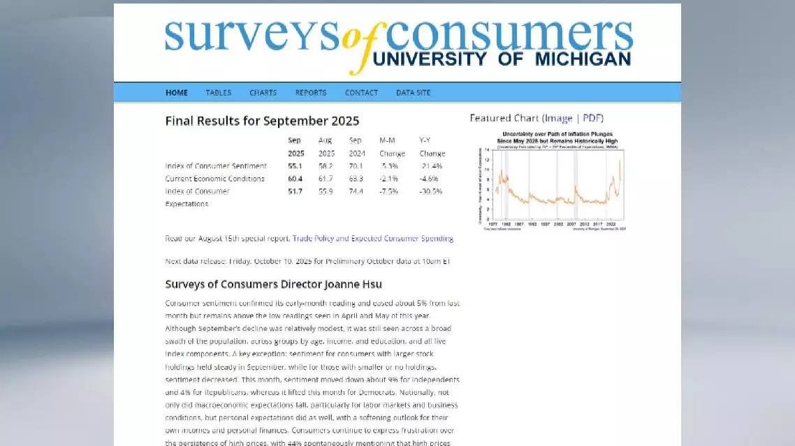 The U.S. Consumer Sentiment Index released Friday by the University of Michigan Surveys of Consumers fell to 55.1 in the September 2025 survey, down from 58.2 in August and below last September's 70.3.
