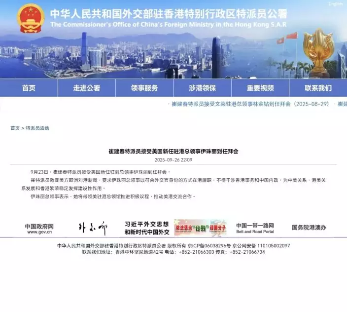 According to a statement from the Foreign Ministry Commissioner's Office in Hong Kong, Commissioner Cui Jianchun had met with the city's new US Consul General, Julie Eadeh who paid a formal visit to the Office on September 23.