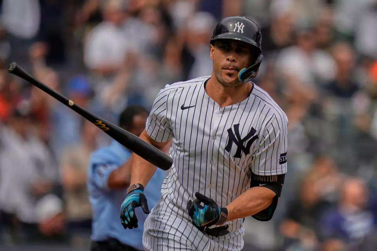 New York Yankees' Giancarlo Stanton tosses his bat after hitting a home run during the second inning of a baseball game against the Baltimore Orioles Saturday, Sept. 27, 2025, in New York. (AP Photo/Frank Franklin II)