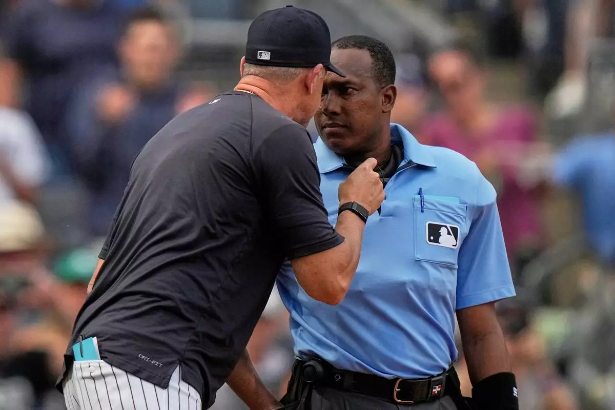 Home plate umpire Ramon de Jesus listens to New York Yankees manager Aaron Boone argue a call during the fifth inning of a baseball game against the Baltimore Orioles Saturday, Sept. 27, 2025, in New York. (AP Photo/Frank Franklin II)