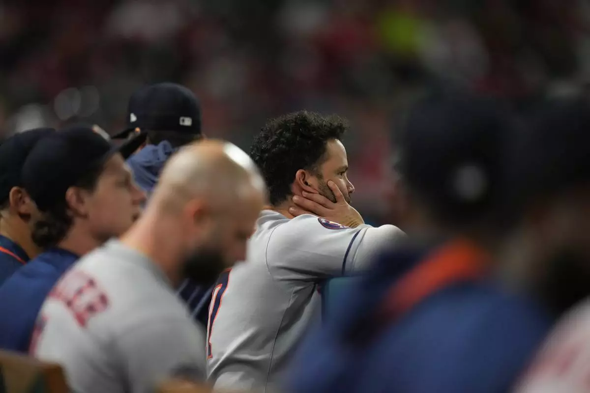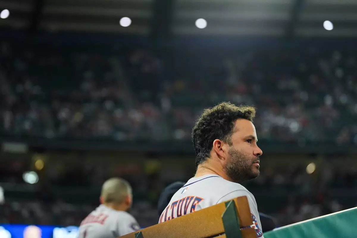 Houston Astros' Jose Altuve watches from the dugout during the second inning of a baseball game against the Los Angeles Angels Saturday, Sept. 27, 2025, in Anaheim, Calif. (AP Photo/Jae C. Hong)
