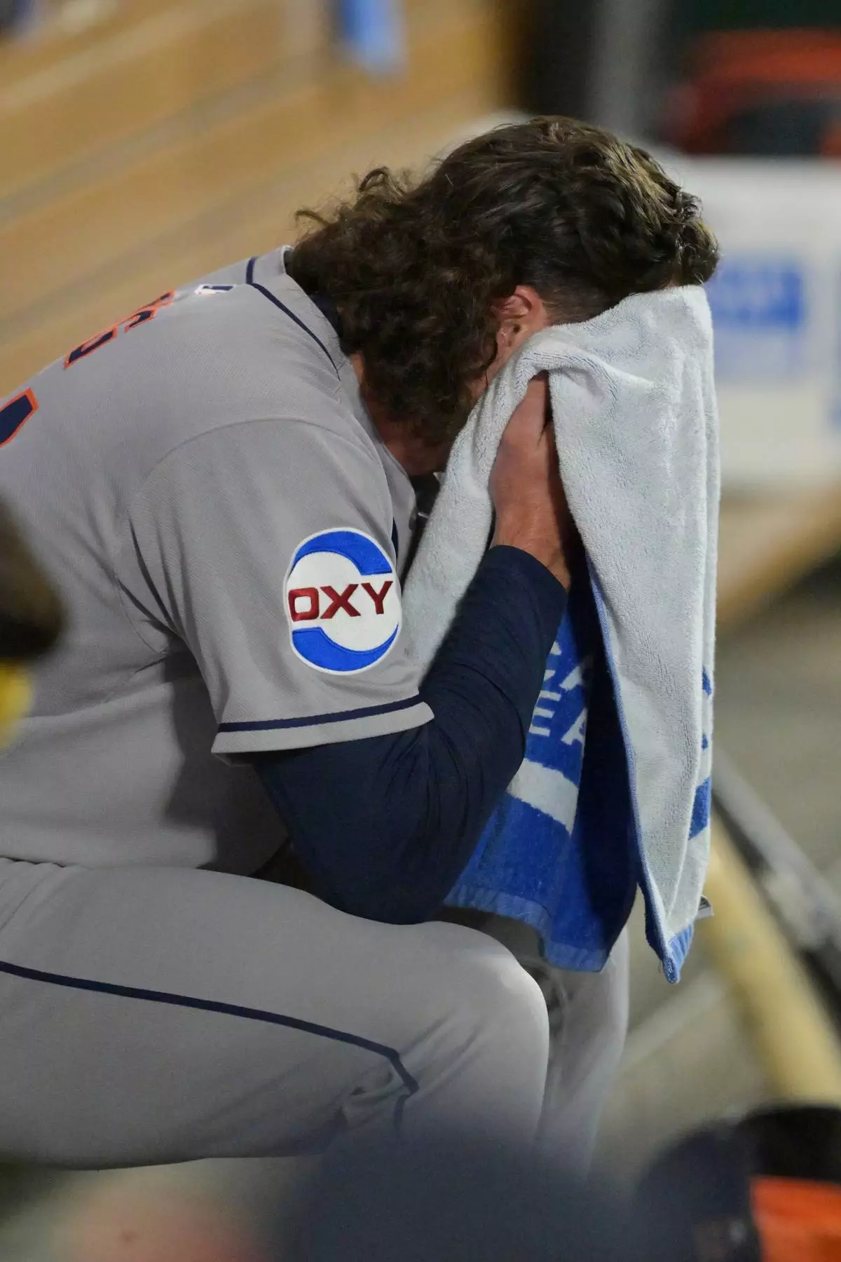 Houston Astros relief pitcher Bryan King sits in the dugout after he was pulled during the eighth inning of a baseball game against the Los Angeles Angels, Friday, Sept. 26, 2025, in Anaheim, Calif. (AP Photo/Jayne Kamin-Oncea)