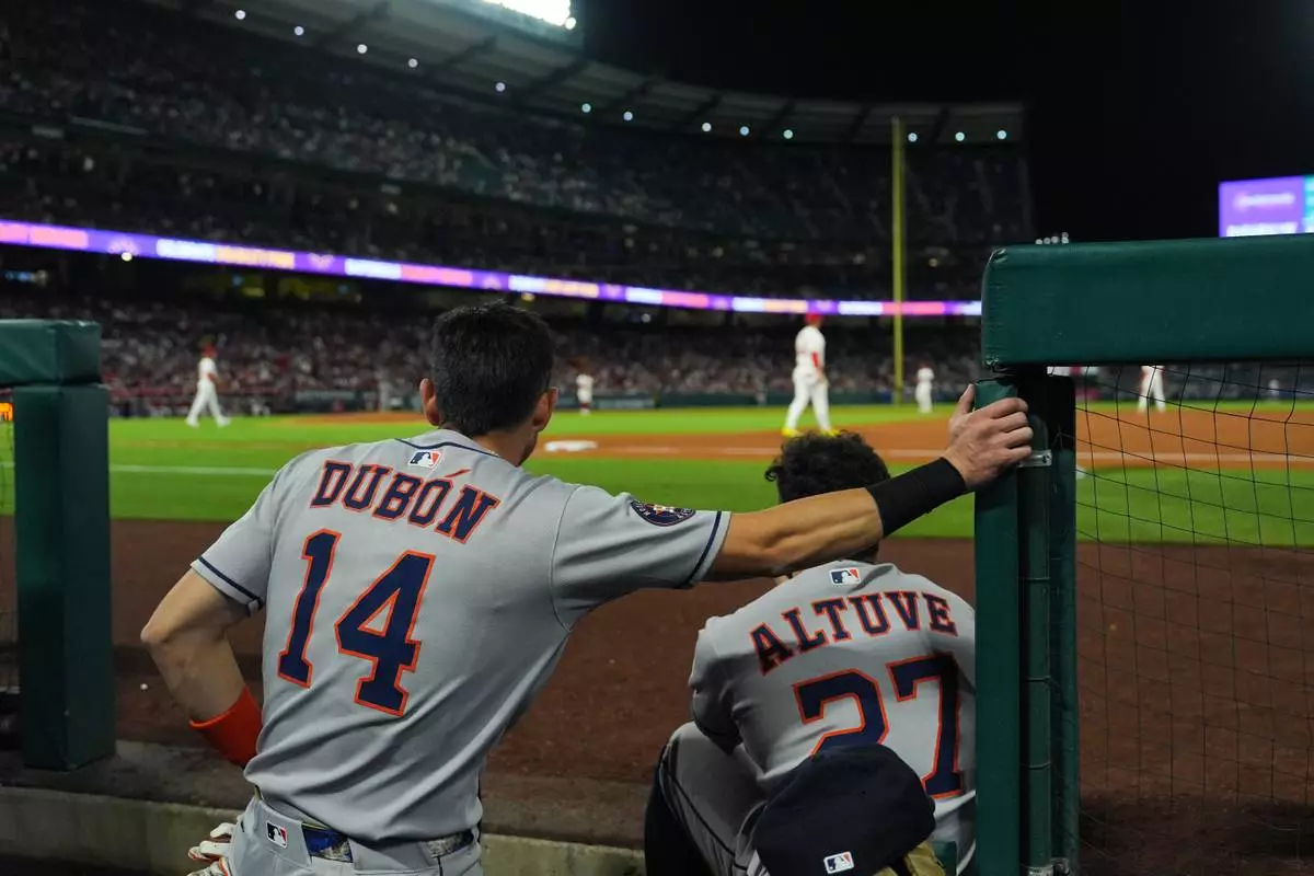 Houston Astros' Mauricio Dubon (14) and Jose Altuve (27) watch from the dugout during the third inning of a baseball game against the Los Angeles Angels Saturday, Sept. 27, 2025, in Anaheim, Calif. (AP Photo/Jae C. Hong)