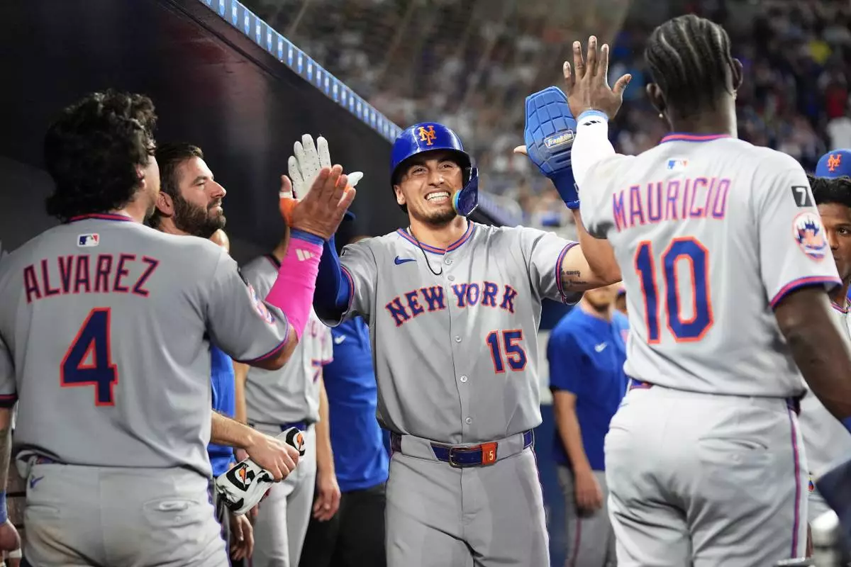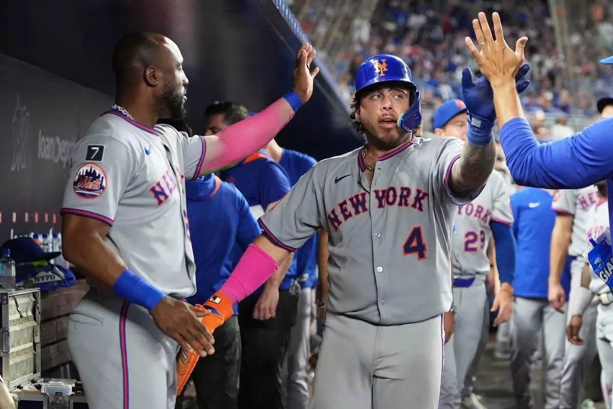 New York Mets' Francisco Alvarez (4) is congratulated in the dugout after scoring on a RBI single hit by Francisco Lindor during the ninth inning of a baseball game, Saturday, Sept. 27, 2025, in Miami. (AP Photo/Lynne Sladky)