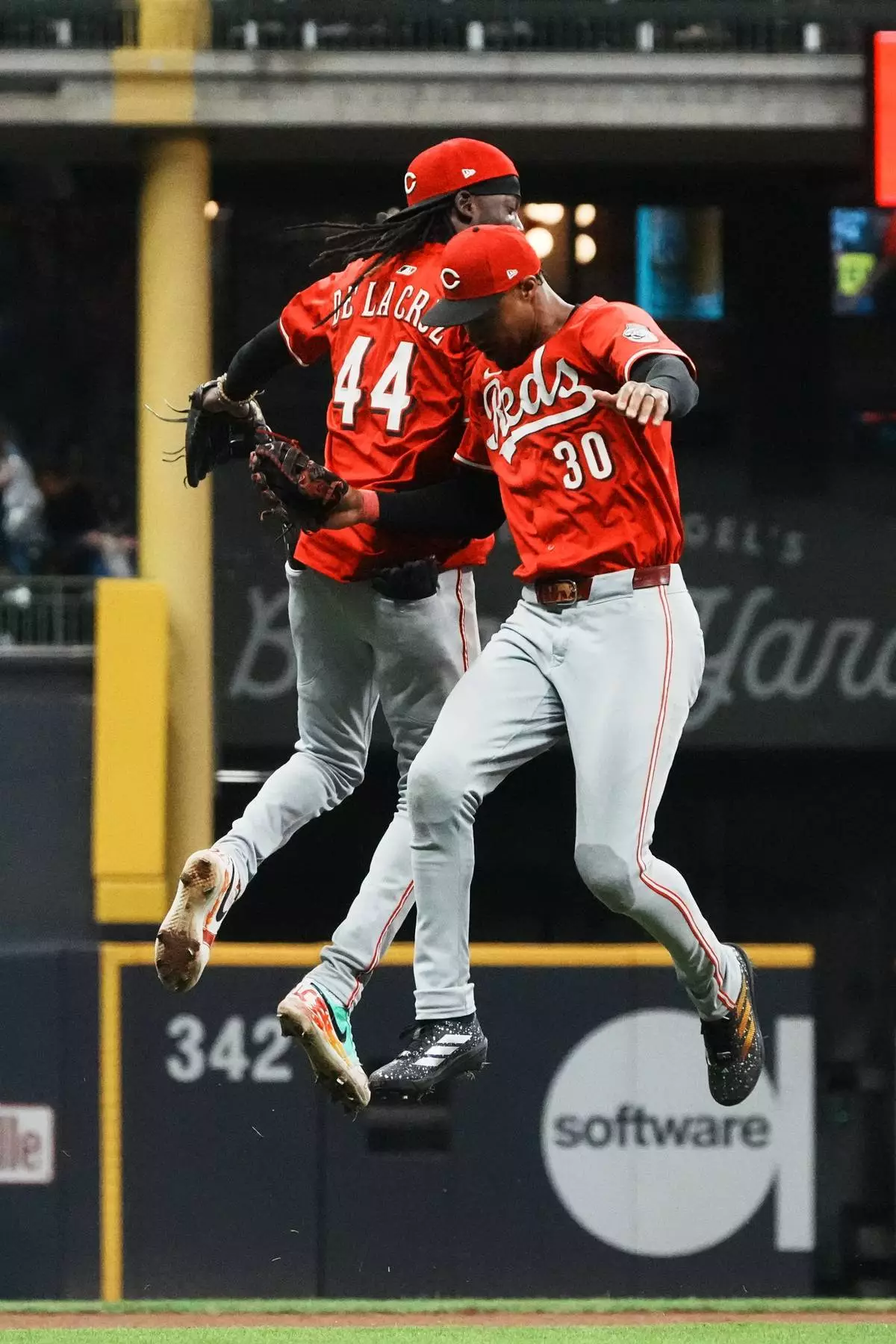 Cincinnati Reds' Elly De La Cruz and Will Benson celebrate after a baseball game against the Milwaukee Brewers Saturday, Sept. 27, 2025, in Milwaukee. (AP Photo/Morry Gash)