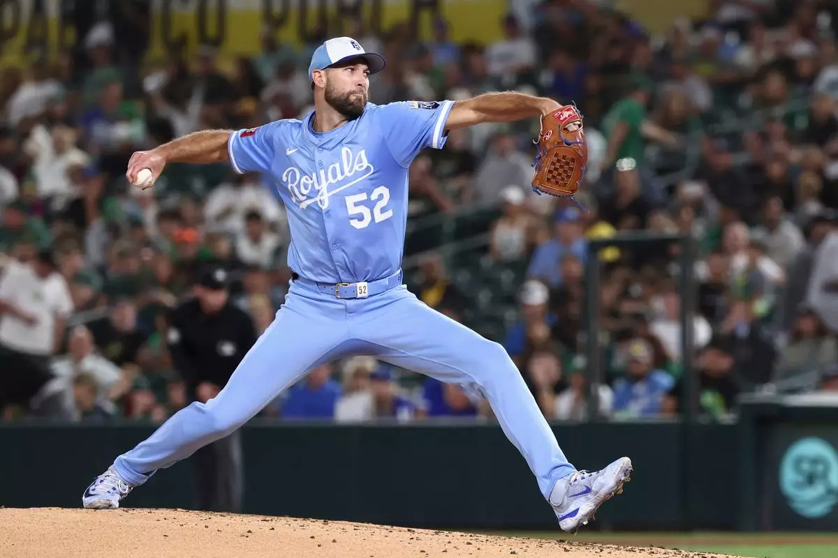 Kansas City Royals pitcher Michael Wacha throws to the Athletics during the first inning of a baseball game Saturday, Sept. 27, 2025, in West Sacramento, Calif. (AP Photo/Sara Nevis)