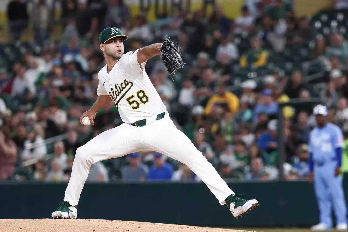 Athletics pitcher Luis Morales throws to the Kansas City Royals during the first inning of a baseball game Saturday, Sept. 27, 2025, in West Sacramento, Calif. (AP Photo/Sara Nevis)
