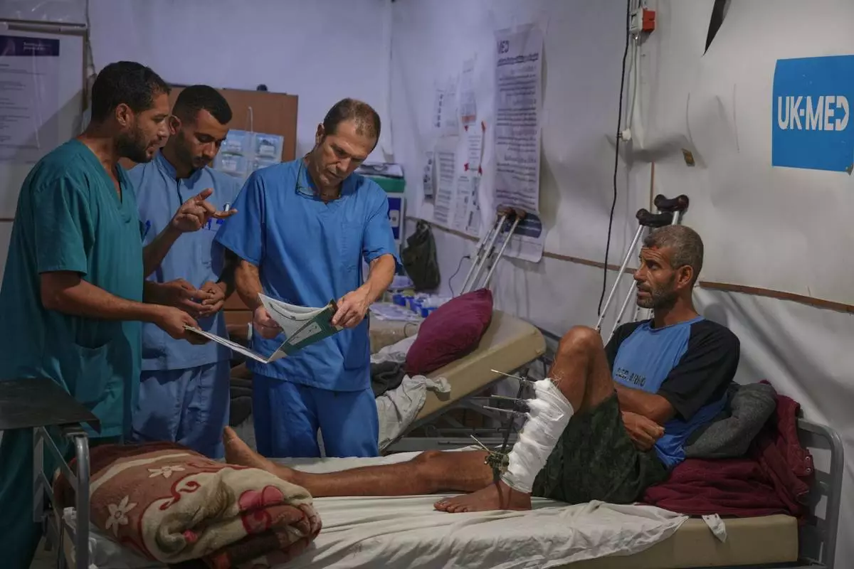 Dr. Paul Ransom of the British humanitarian medical NGO UK-Med, assisted by local medical staff, treats patients at a field hospital in Muwasi, near Khan Younis in the southern Gaza Strip, Saturday, Sept. 27, 2025. (AP Photo/Jehad Alshrafi)