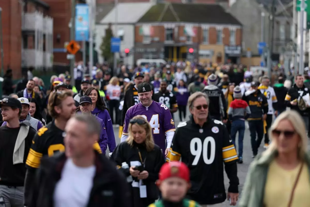 Steelers supporters arrive to watch the NFL football game between Minnesota Vikings and Pittsburgh Steelers at Croke Park stadium in Dublin, Sunday, Sept. 28, 2025.(AP Photo/Peter Morrison)