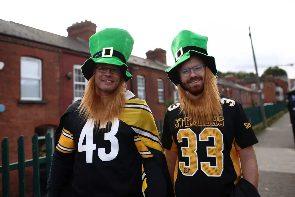 They were decked out in black-and-gold-striped overalls as they made their way through the crowd to get inside for Ireland's first regular-season NFL game.
