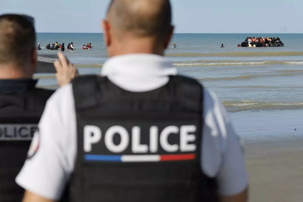 French police officers take photos of migrants as they board a small boat to reach Britain, in Gravelines, northern France, France, Friday, Sept. 19, 2025. (AP Photo/Jean-Francois Badias)