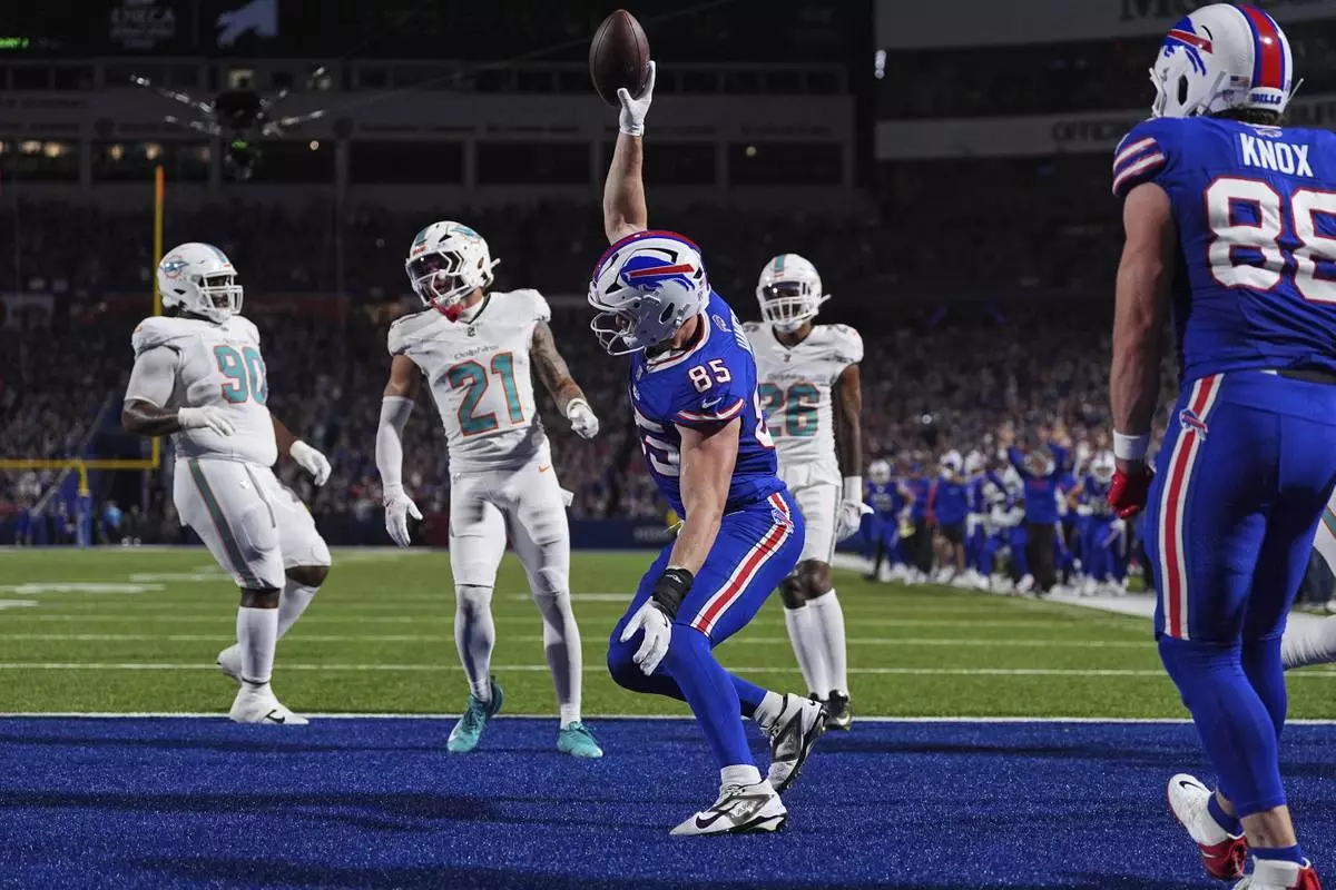 Buffalo Bills tight end Jackson Hawes (85) celebrates after scoring a touchdown against the Miami Dolphins during the first half of an NFL football game, Thursday, Sept. 18, 2025, in Orchard Park, N.Y. (AP Photo/Matt Rourke)