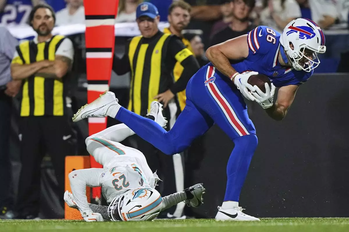 Buffalo Bills tight end Dalton Kincaid (86) runs past Miami Dolphins cornerback Jack Jones (23) for a touchdown during the first half of an NFL football game, Thursday, Sept. 18, 2025, in Orchard Park, N.Y. (AP Photo/Matt Rourke)
