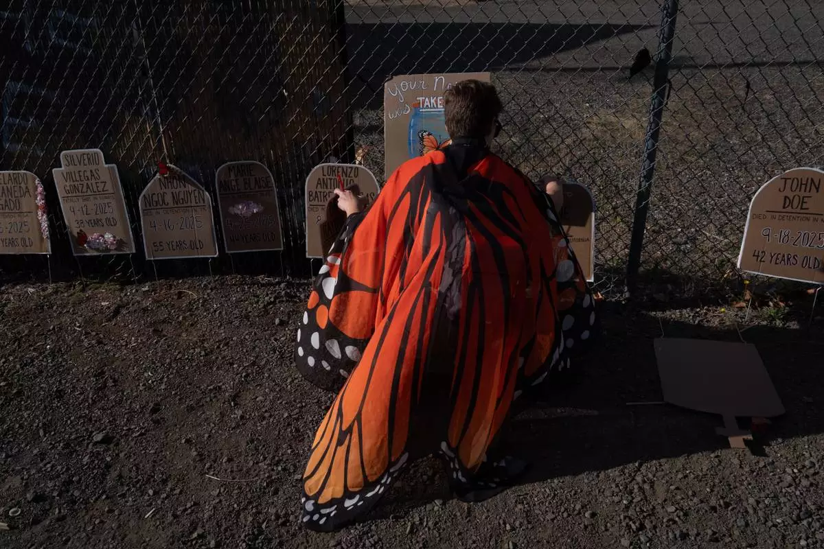 A protester puts out plaques for a memorial outside a U.S. Immigration and Customs Enforcement facility on Sunday, Sept. 28, 2025, in Portland, Ore. (AP Photo/Jenny Kane)