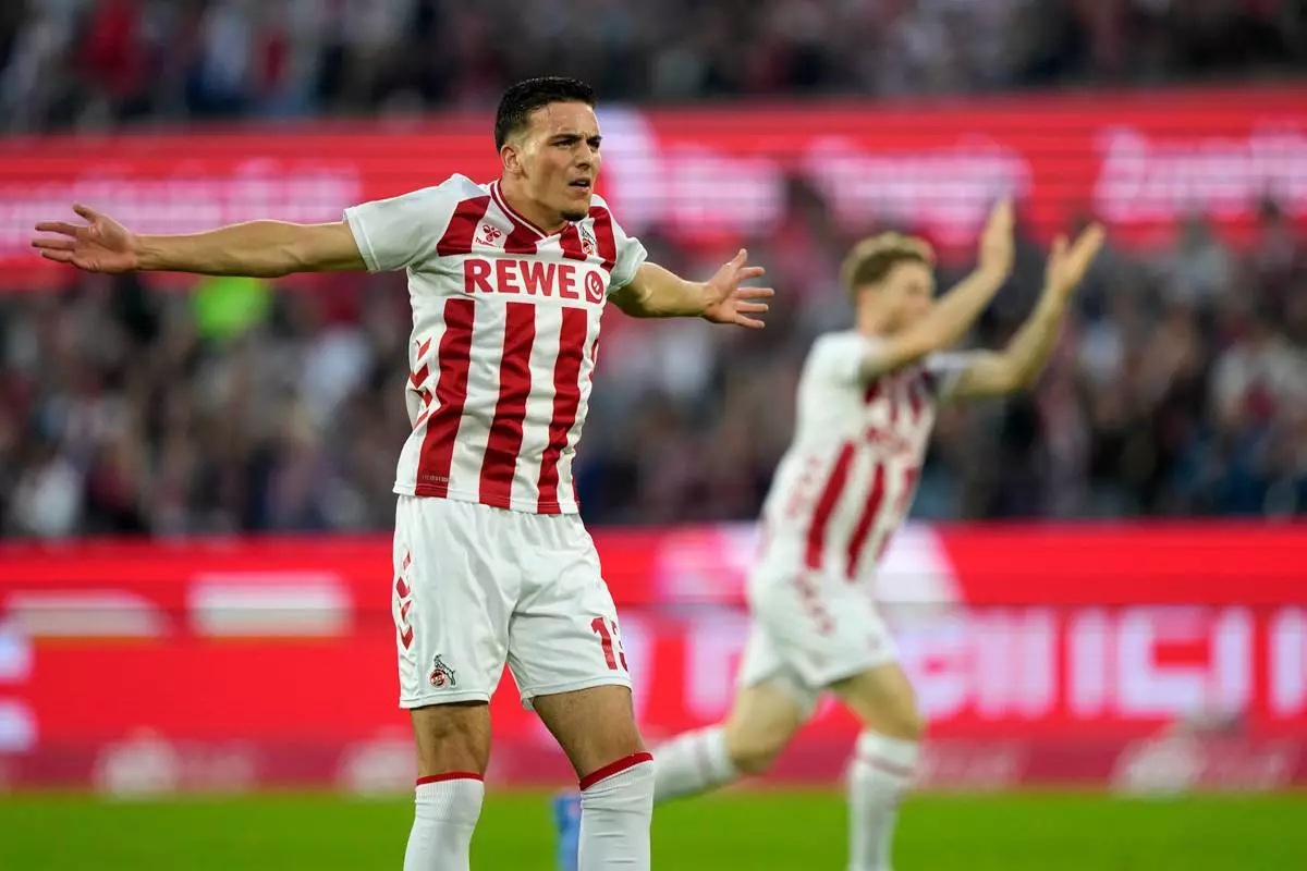 Cologne's Said El Mala reacts during the German Bundesliga soccer match between Cologne and Stuttgart in Cologne, Germany, Sunday, Sept. 28, 2025. (AP Photo/Martin Meissner)