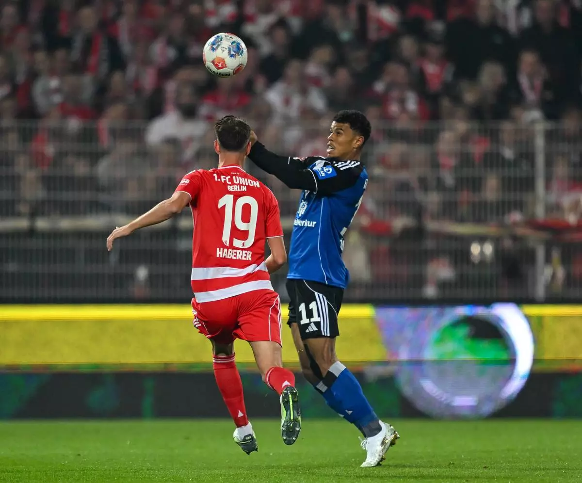Berlin's Janik Haberer, left, and Hamburger's Ransford Königsdörffer in action during the Bundesliga soccer match between FC Union Berlin and Hamburger SV in Berlin, Sunday Sept. 28, 2025. (Soeren Stache/dpa via AP)