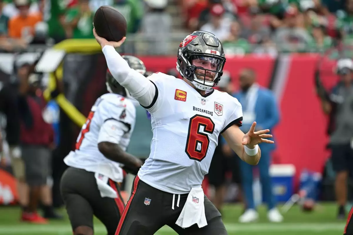 Tampa Bay Buccaneers quarterback Baker Mayfield (6) throws during the first half of an NFL football game against the Philadelphia Eagles, Sunday, Sept. 28, 2025, in Tampa, Fla. (AP Photo/Jason Behnken)