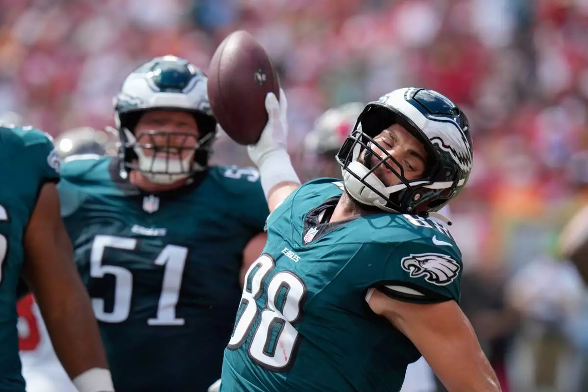 Philadelphia Eagles tight end Dallas Goedert (88) reacts after a touchdown during the first half of an NFL football game against the Tampa Bay Buccaneers, Sunday, Sept. 28, 2025, in Tampa, Fla. (AP Photo/Chris O'Meara)