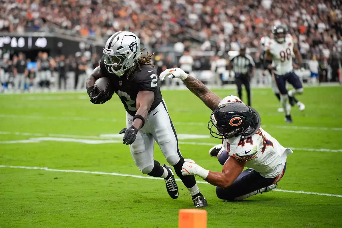 Las Vegas Raiders running back Ashton Jeanty (2) is grabbed by Chicago Bears free safety Kevin Byard (31) as he runs toward the end zone for a touchdown during the first half of an NFL game, Sunday, Sept. 28, 2025, in Las Vegas. (AP Photo/David Becker)