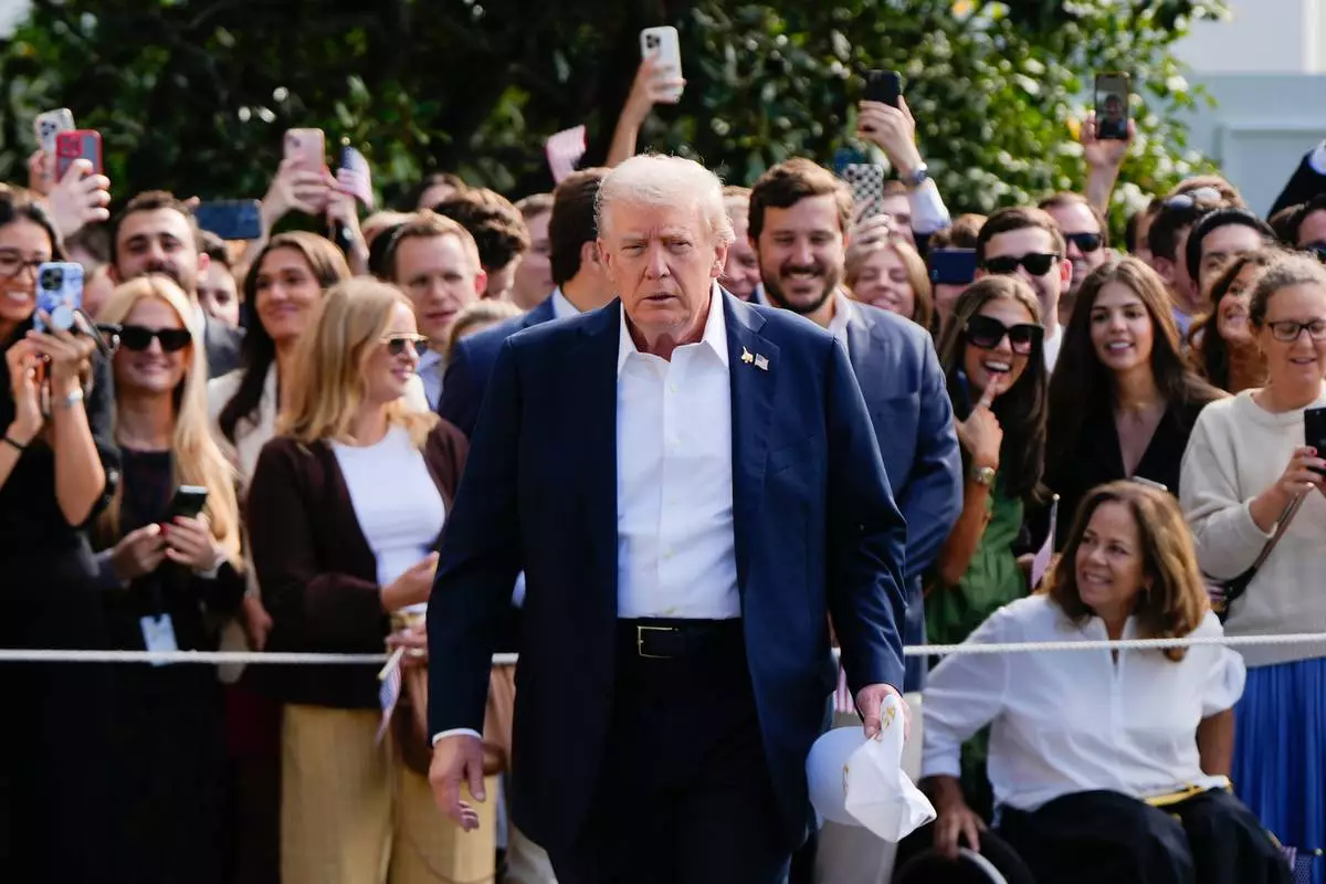 President Donald Trump walks to speak with reporters after greeting supporters before departing the White House, Friday, Sept. 26, 2025, in Washington. (AP Photo/Julia Demaree Nikhinson)
