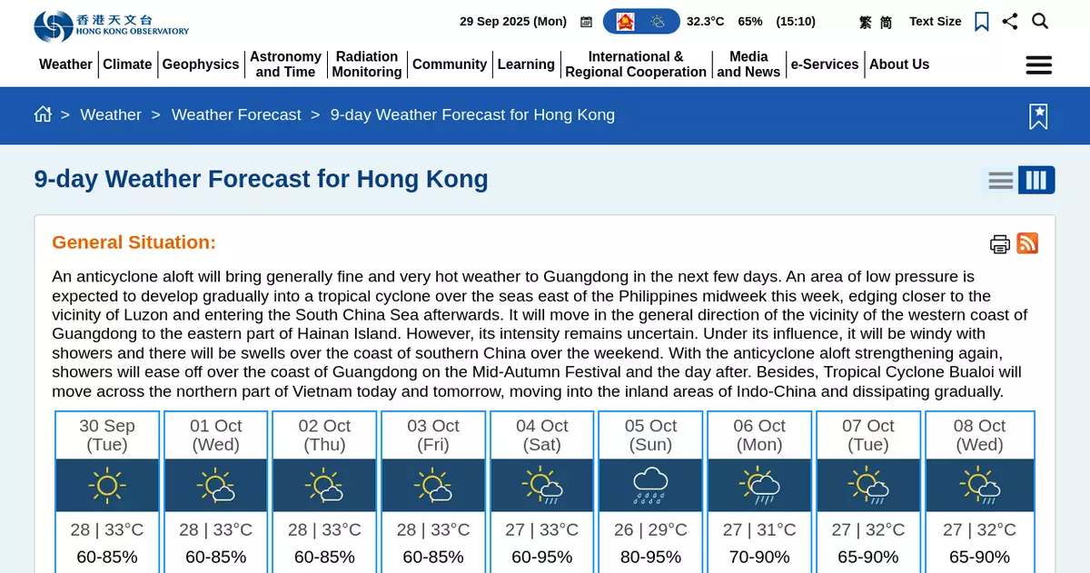 Please refer to the 9-day Weather Forecast issued by the Hong Kong Observatory and the Weather Information for Astronomical Observation webpage for the latest weather conditions and the astronomical observing conditions during the Mid-Autumn Festival period to plan moon-watching activities.
