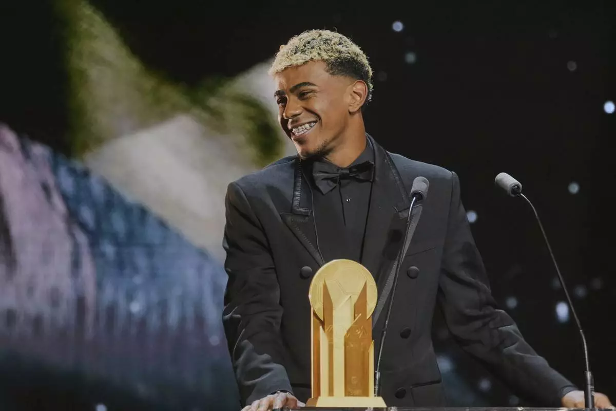 Barcelona's Spanish player Lamine Yamal receives the Kopa Trophy during the 69th Ballon d'Or (Golden Ball) award ceremony at Theatre du Chatelet in Paris, Monday, Sept. 22, 2025. (AP Photo/Thibault Camus)