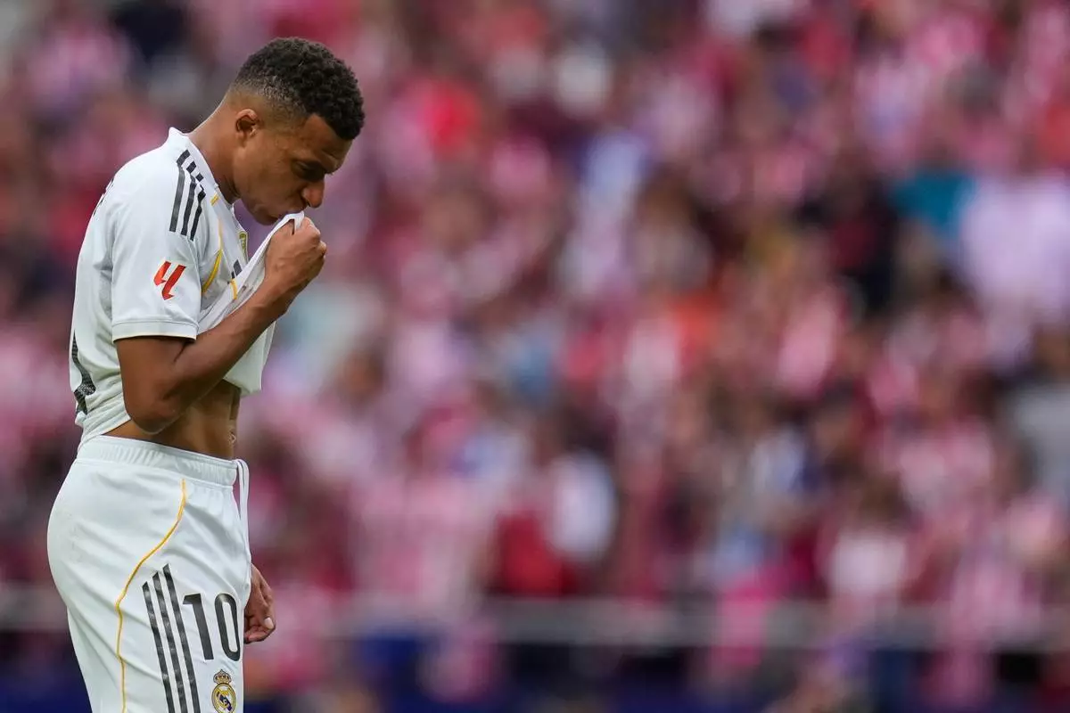 Real Madrid's Kylian Mbappe looks down during the Spanish La Liga soccer match between Atletico Madrid and Real Madrid at Metropolitano stadium, in Madrid, Spain, Saturday, Sept. 27, 2025. (AP Photo/Manu Fernandez)