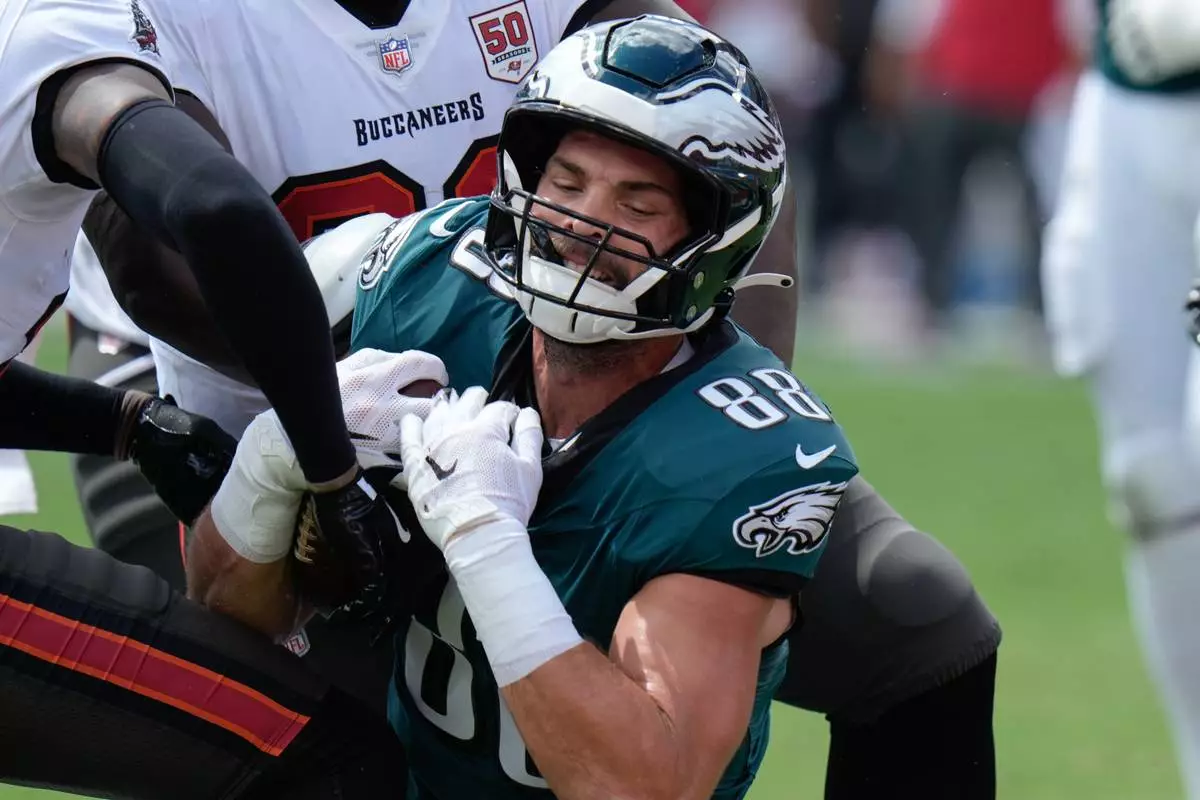 Philadelphia Eagles tight end Dallas Goedert (88) scores a touchdown during the first half of an NFL football game against the Tampa Bay Buccaneers, Sunday, Sept. 28, 2025, in Tampa, Fla. (AP Photo/Chris O'Meara)