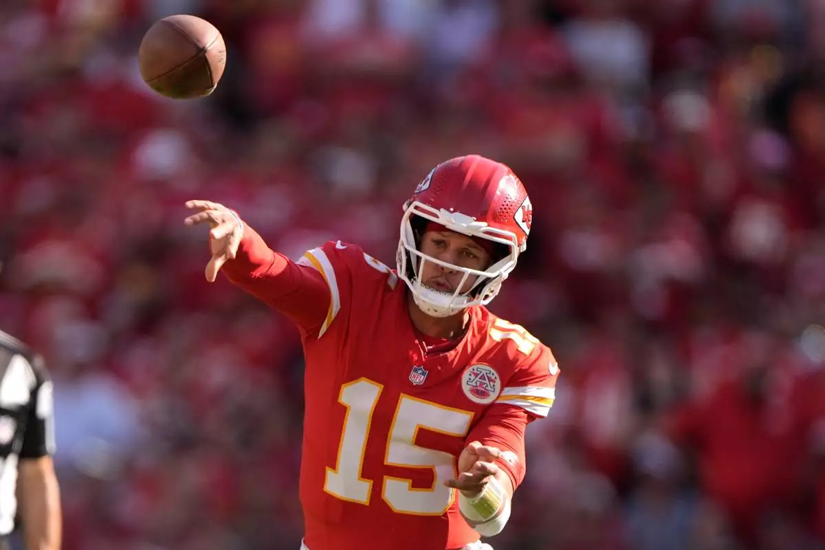 Kansas City Chiefs quarterback Patrick Mahomes (15) throws during the first half of an NFL football game against the Baltimore Ravens Sunday, Sept. 28, 2025, in Kansas City, Mo. (AP Photo/Charlie Riedel)