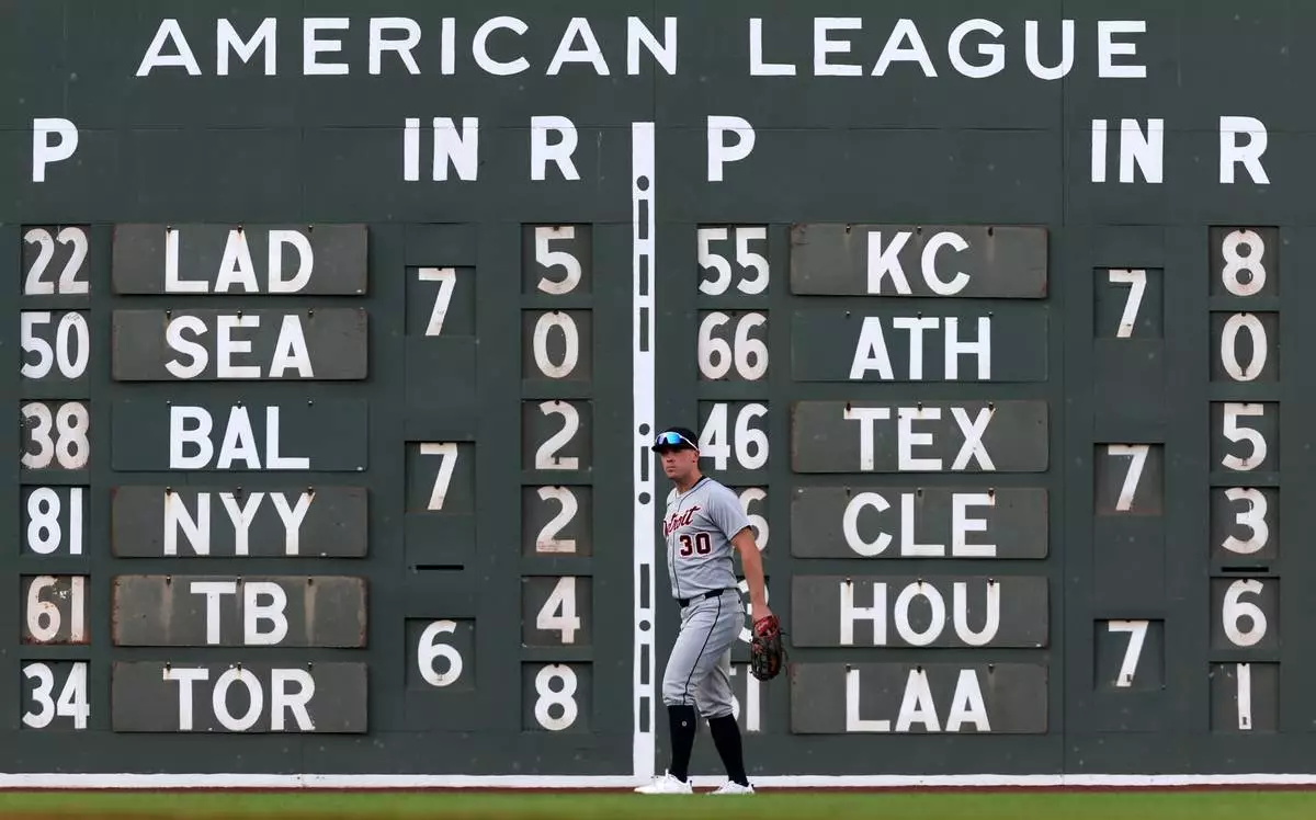 Detroit Tigers leftfielder Kerry Carpenter walks in front of the scoreboard on the Green Monster during a baseball game against the Boston Red Sox, Sunday, Sept. 28, 2025, in Boston. (AP Photo/Jim Davis)