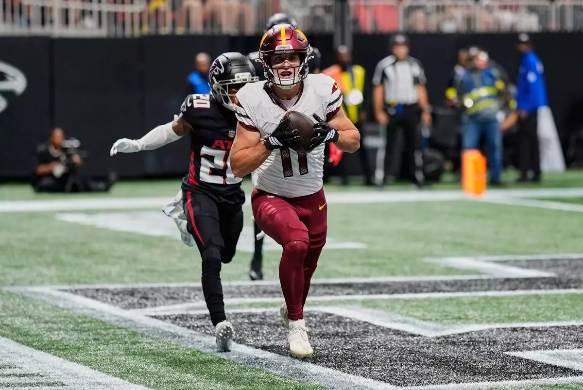 Washington Commanders wide receiver Luke McCaffrey (11) scores a touchdown past Atlanta Falcons cornerback Dee Alford (20) during the first half of an NFL football game, Sunday, Sept. 28, 2025, in Atlanta. (AP Photo/Mike Stewart)
