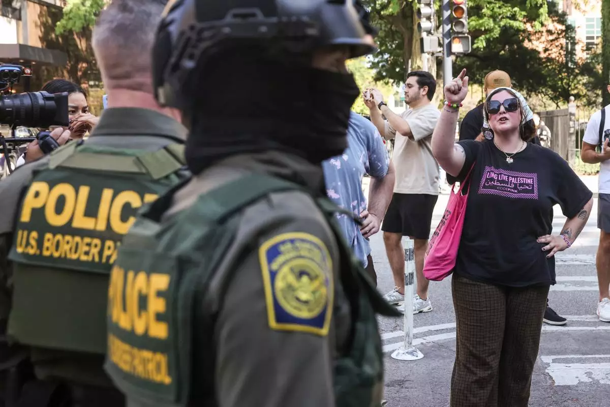 Pedestrians yell at federal agents from U.S. Immigration and Customs Enforcement and U.S. Customs and Border Protection as they stand on North Clark Street at West Oak Street in River North, Sunday, Sept. 28, 2025, in Chicago. (Ashlee Rezin/Chicago Sun-Times via AP)