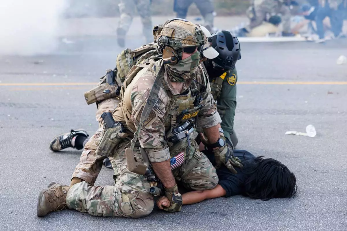 Federal officers hold down a protestor in the Brighton Park neighborhood of Chicago, on Saturday, Oct. 4, 2025, after protesters learned that U.S. Border Patrol shot a woman Saturday morning on Chicago's Southwest Side. (Anthony Vazquez/Chicago Sun-Times via AP)