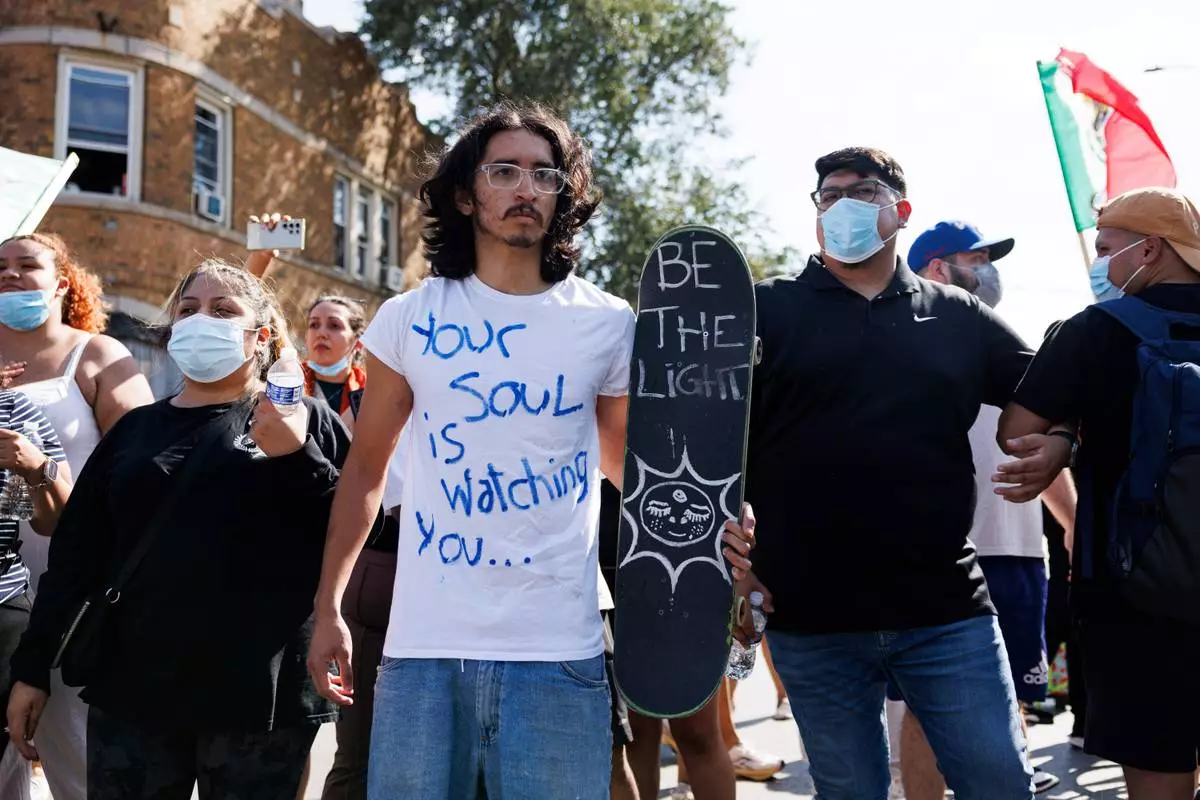 Protesters stand and chant in the Brighton Park neighborhood of Chicago, on Saturday, Oct. 4, 2025, after protesters learned that U.S. Border Patrol shot a woman Saturday morning on Chicago's Southwest Side. (Anthony Vazquez/Chicago Sun-Times via AP)
