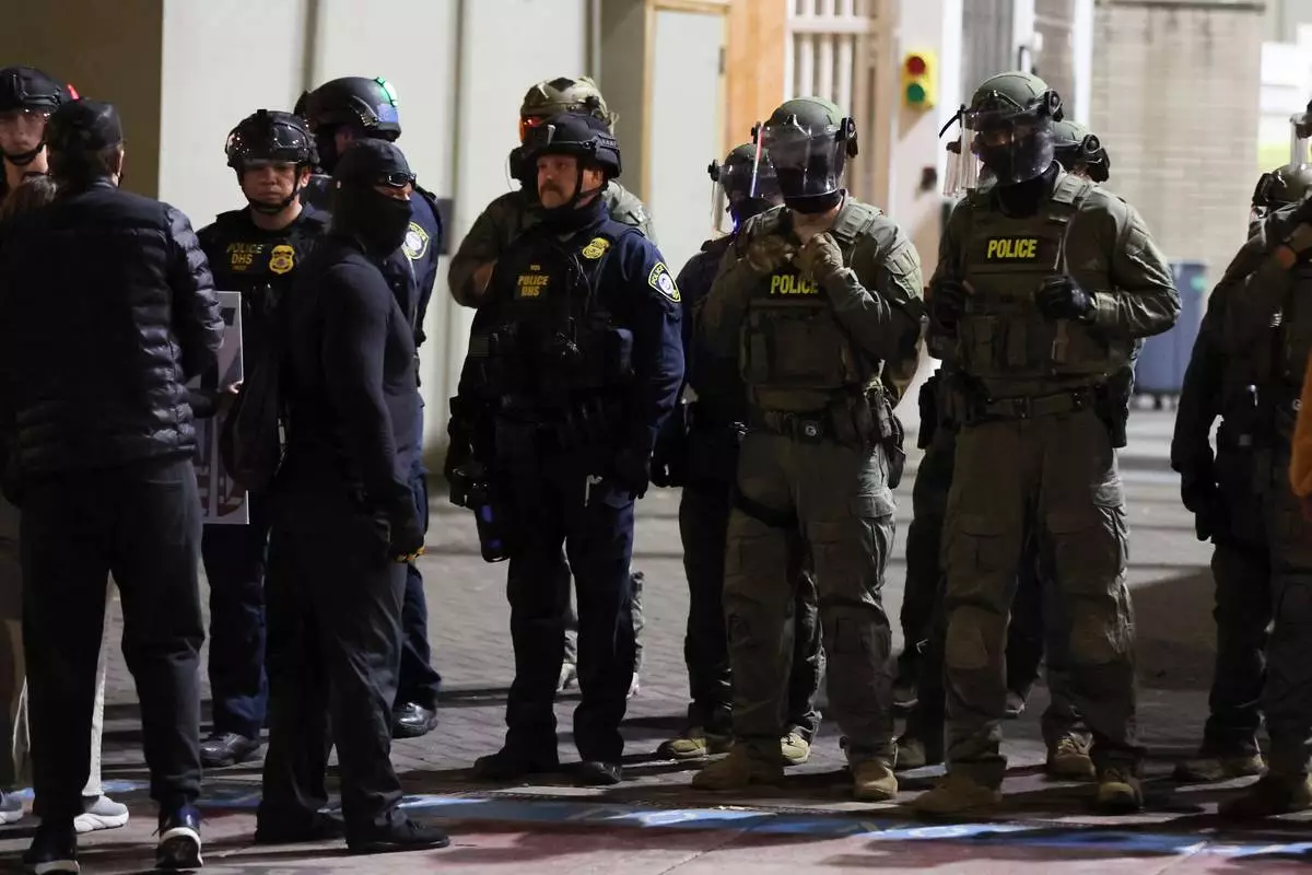 Police and Federal officers stand guard an area by the U.S. Immigration and Customs Enforcement facility in Portland, Ore. on Sunday, October. 5, 2025. (AP Photo/Ethan Swope)