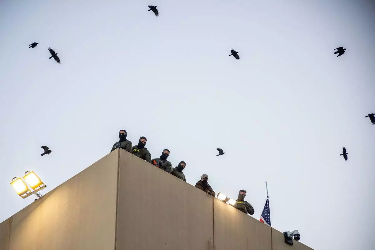 Police and federal officers stand guard on the roof of the U.S. Immigration and Customs Enforcement facility in Portland, Ore., Sunday, Oct. 5, 2025. (AP Photo/Ethan Swope)