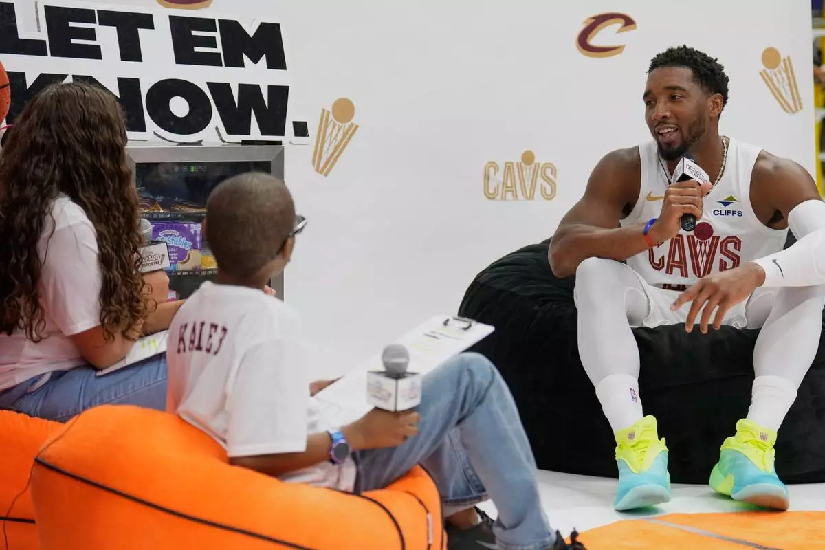 Cleveland Cavaliers guard Donovan Mitchell, right, talks with junior reporters during the NBA basketball team's media day Monday, Sept. 29, 2025, in Cleveland. (AP Photo/Sue Ogrocki)