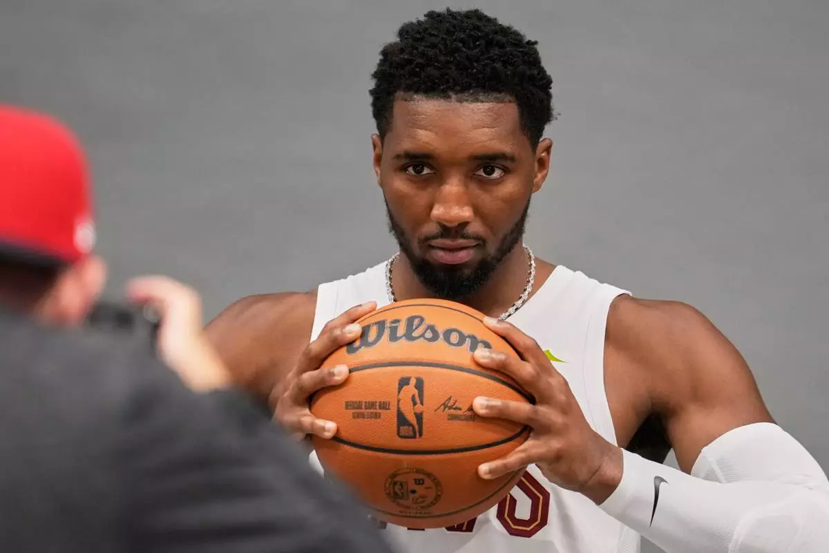 Cleveland Cavaliers guard Donovan Mitchell poses for photos during the NBA basketball team's media day Monday, Sept. 29, 2025, in Cleveland. (AP Photo/Sue Ogrocki)