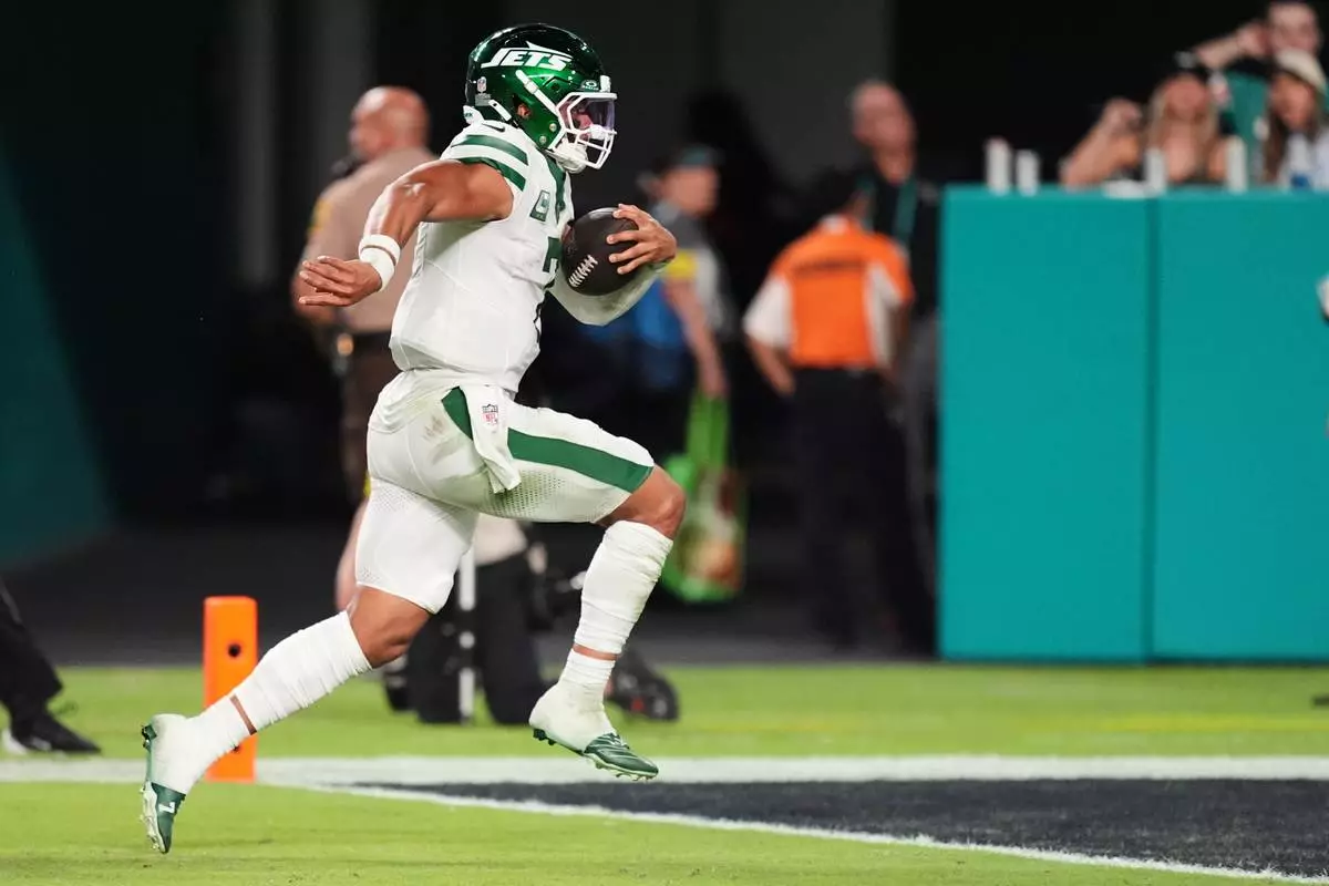 New York Jets quarterback Justin Fields runs the ball for a touchdown in the second half of an NFL football game, Monday, Sept. 29, 2025, in Miami Gardens, Fla. (AP Photo/Rebecca Blackwell)
