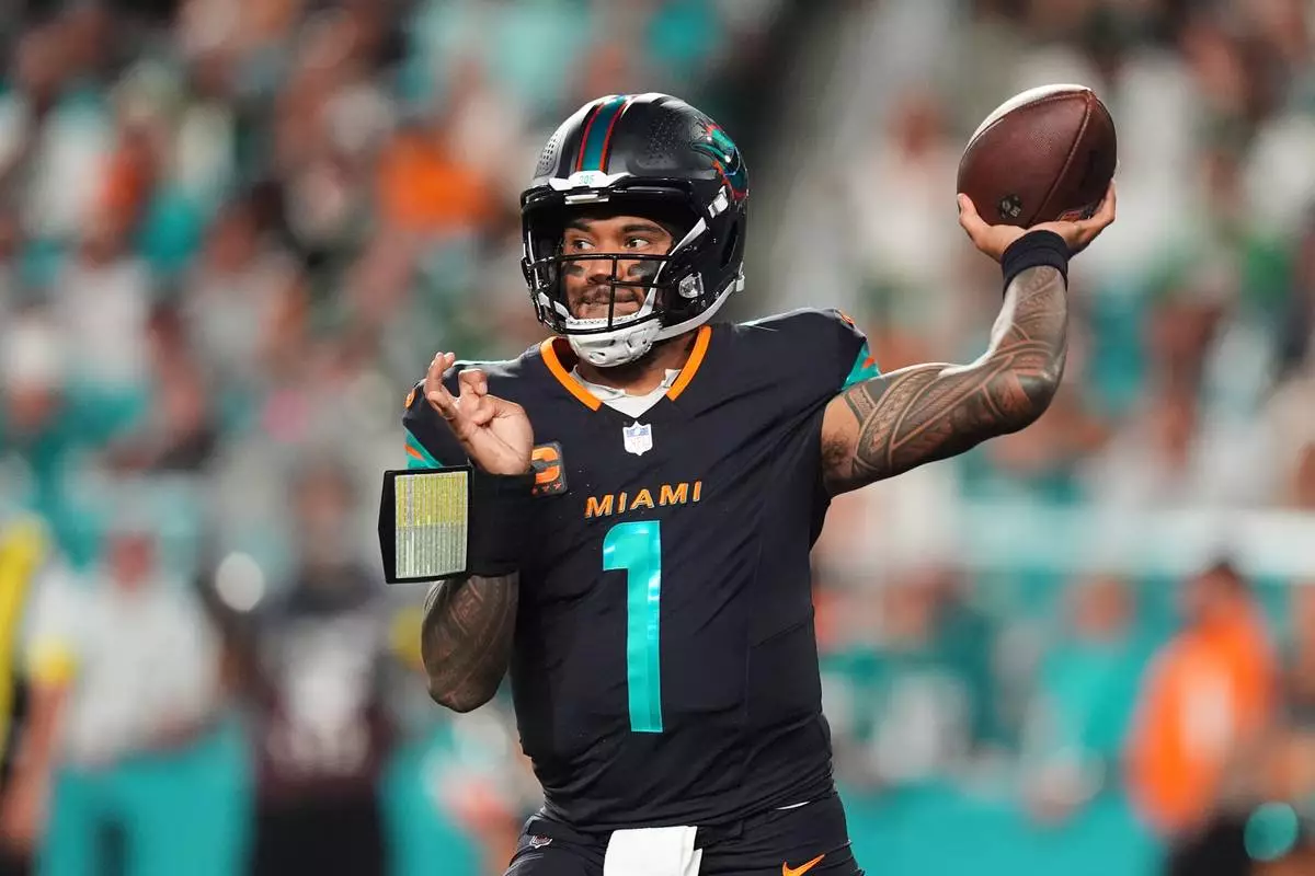 Miami Dolphins quarterback Tua Tagovailoa (1) throws a pass in the first half of an NFL football game against the New York Jets, Monday, Sept. 29, 2025, in Miami Gardens, Fla. (AP Photo/Rebecca Blackwell)