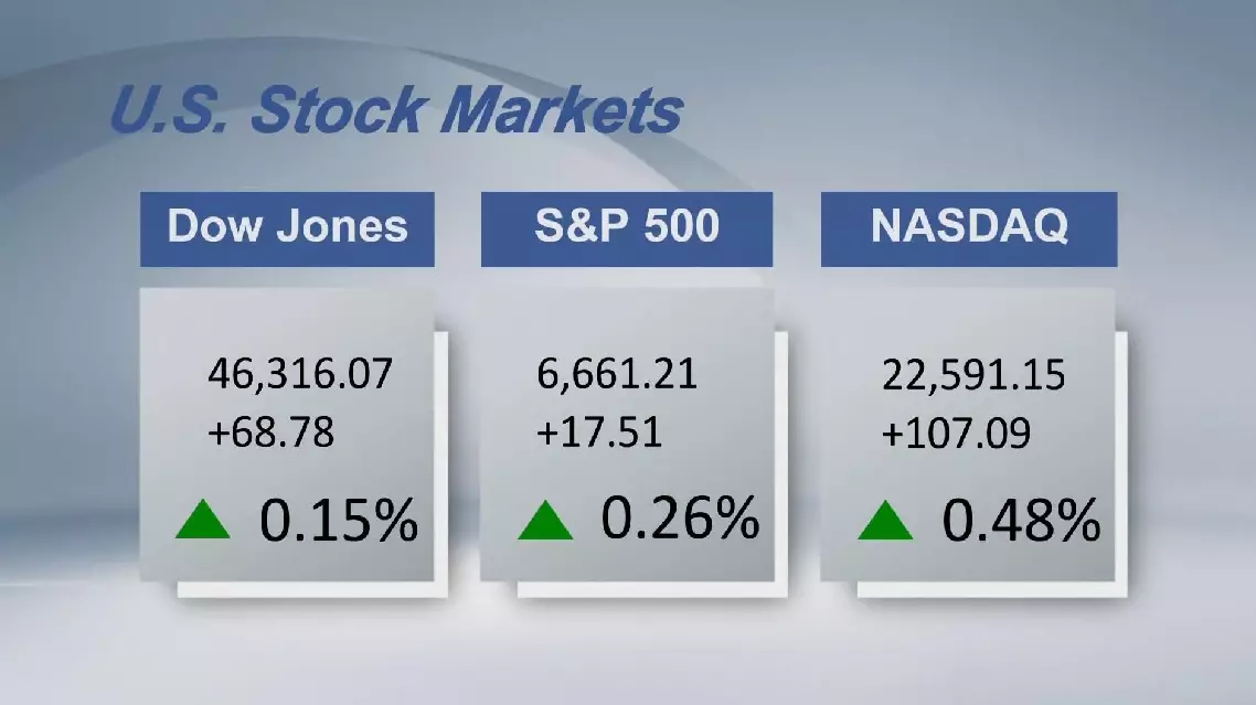 The Dow Jones Industrial Average rose 68.78 points, or 0.15 percent, to 46,316.07. The Standard and Poor's 500 added 17.51 points, or 0.26 percent, to 6,661.21. The Nasdaq Composite Index increased by 107.09 points, or 0.48 percent, to 22,591.15.