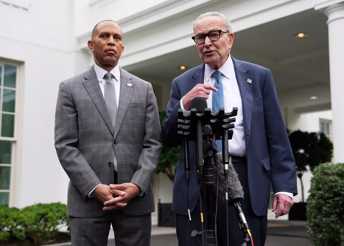 Senate Minority Leader Chuck Schumer, D-N.Y., right, and House Minority Leader Hakeem Jeffries, D-N.Y., speak to members of the media outside the West Wing at the White House in Washington, Monday, Sept. 29, 2025, in Washington. (AP Photo/Evan Vucci)